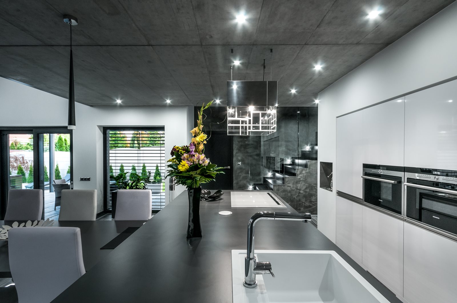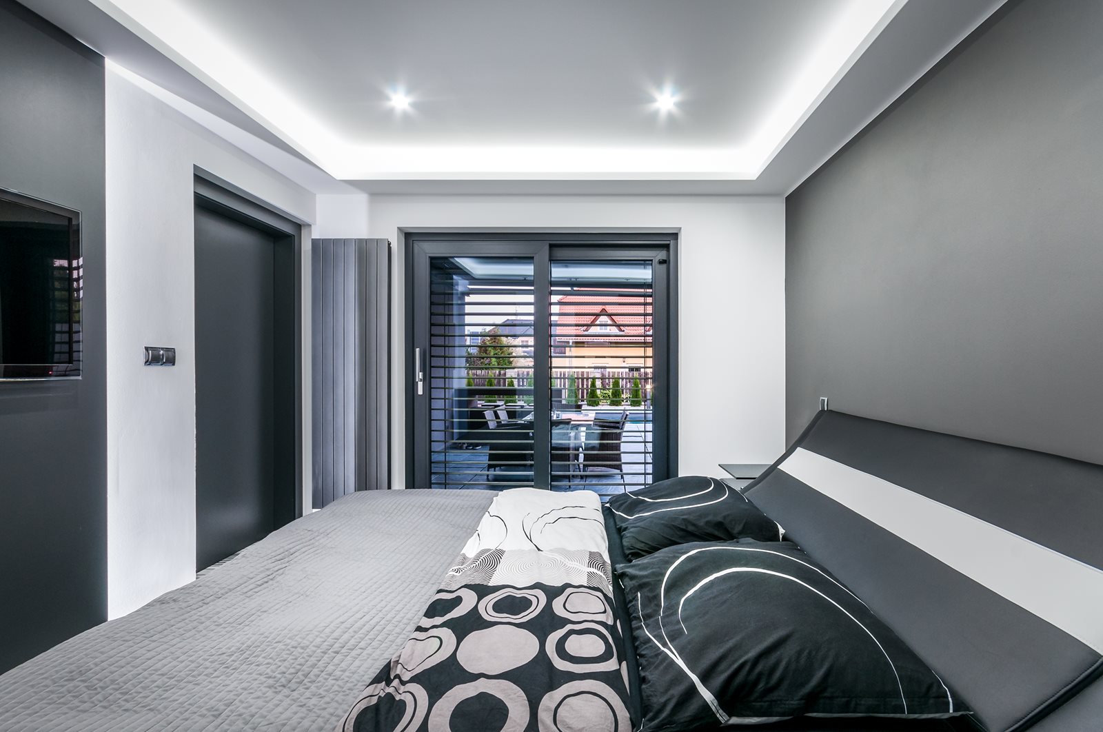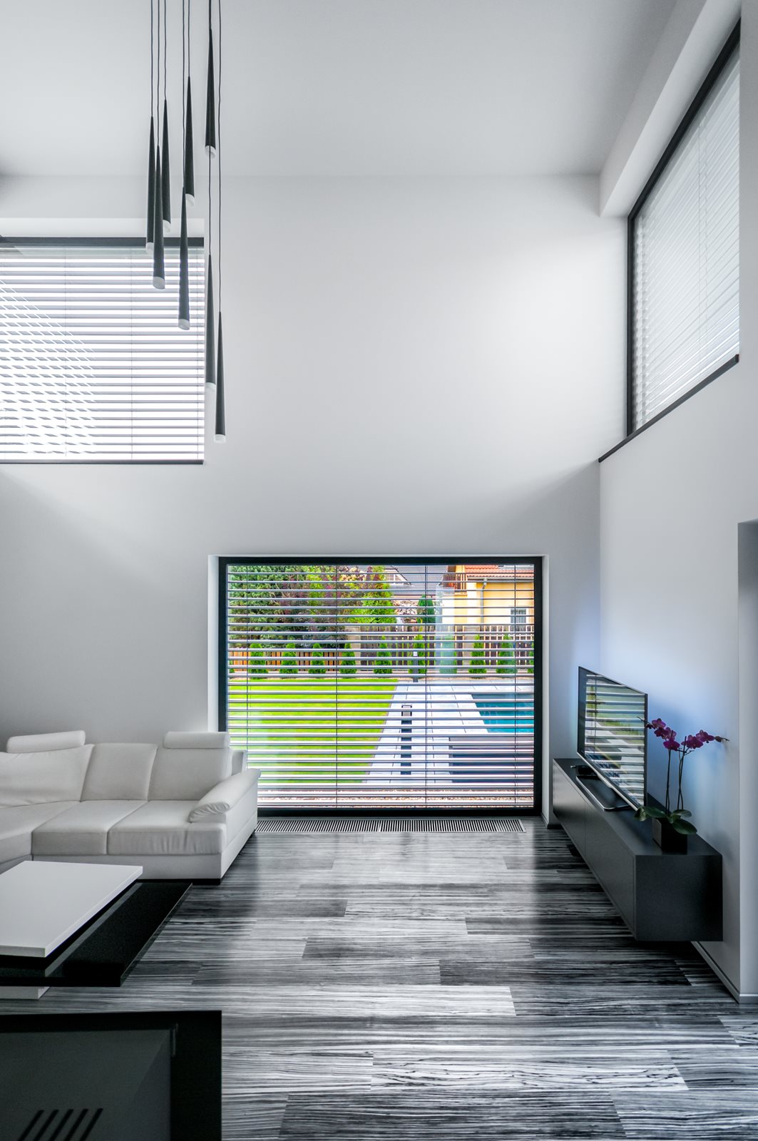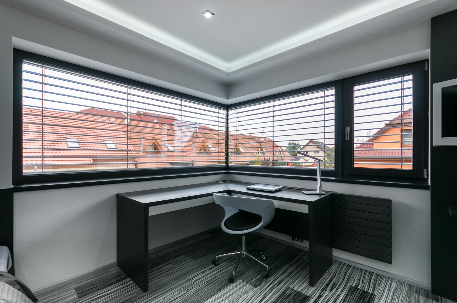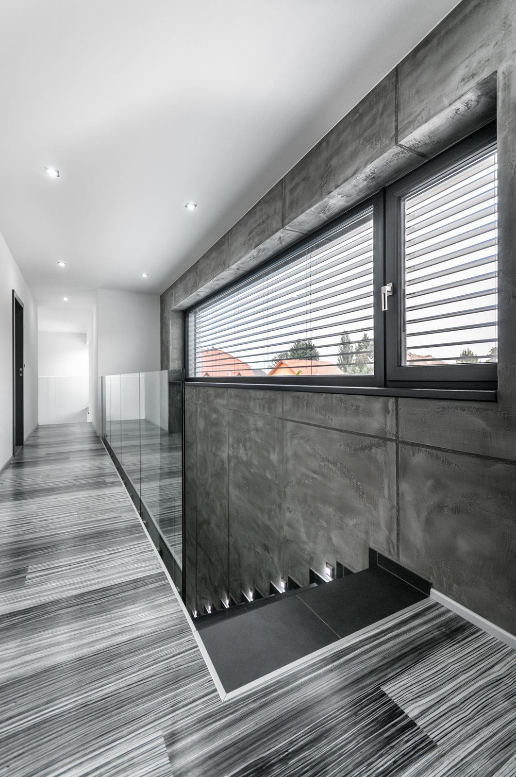 Широко оразмерените прозорци (3,5 x 2,4 м и 4,5 x 1,3 м) характеризират архитектурата на тази къща. Всички стъклени решения за без рамки, със стъкло в стъкло оформят ъгловите прозорци както и големите плъзгащи се врати – всичко това съгласно строителния стандарт Пасивна къща, – които осигурят много естествена светлина и проветлива атмосфера. Използваните прозоречни профили Eforte създадоха безпроблемно няколкостотин килограма стъклопакет. Наподобяващият цвят на антрацит на орнаментите се съчетава перфектно с цветовете на фасадата и металния покрив.